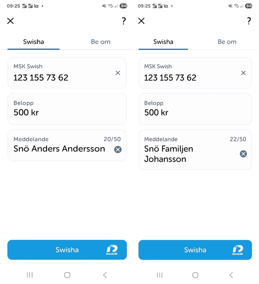 Swisha 500 kronor till 123 155 73 62 och märk betalningen ”Snö + [Text på skylten]”